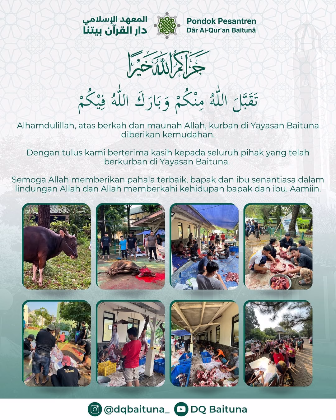 Terima kasih yang sebesar-besarnya kami sampaikan kepada para donatur, orang tua santri, serta seluruh pihak yang telah berpartisipasi dan mempercayakan kurbannya melalui Yayasan Baituna.